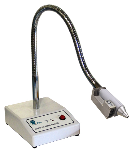 The IN4000PE flexible nozzle neck frees the operator’s hands during assembly and manufacturing processes. A photoelectric eye controls both ionization and airflow, which reduces compressed air costs and extends the life of the ionizer. The model IN4000PE ionizing air nozzle produces a 68KHz AC output of approximately 2200V and a continuous stream of balanced air ions.