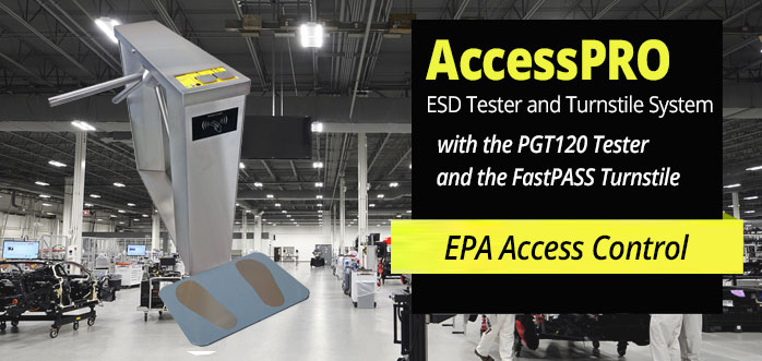 The AccessPRO system with the PGT120 and the FastPass turnstile tests personnel grounding devices, logs test data and user IDs and controls access to an ESD protected area.